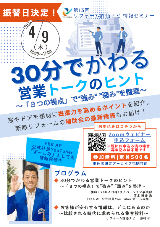 今回のセミナーでは、YKK AP株式会社の【公式】社員YouTuber「ずーしみ」こと、清水陽介氏を講師にお迎えし、窓やドアを題材に「お客様の心を動かす提案力アップの秘訣」をお届けします!さらに、今注目の「断熱リフォーム」に活用できる【最新の補助金情報】もご紹介予定!実践に役立つヒントが満載の内容です。是非ご参加ください。
